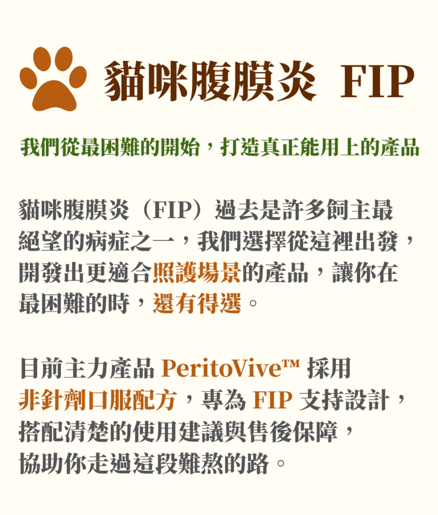 寵煥國際|寵物內科保健品守護毛孩每一次關鍵時刻 我們專注於寵物健康保健品創新,整合國際技術,打造針對性、高效能的照護方案。旗下產品 PeritoVive™為貓咪腹膜炎FIP設計,快速口服、溫和安心。 了解詳情 好餵不抗拒 產品皆採非針劑口服設計,針對貓咪餵食困難與照護者操作不便的情況,設計易於餵食的膠囊或液態劑型,減少抗拒與風險,讓居家照護更安心。 針對性配方 專為不同疾病狀況開發,不做萬用補充品每一項產品皆由專業研發團隊根據不同疾病機轉與照護需求設計,不追求通用營養補充,以支持特定健康問題為核心目標。 成效有回饋 至今,已累積近萬筆來自飼主與獸醫的實際使用紀錄,這些真實數據與持續追蹤,讓我們對自家產品的成效與安全性有足夠信心,願意做出實質的售後承諾,陪伴飼主走完這段不容易的照護旅程。 下一步,我們也正在準備好除了 FIP, 我們正持續研發以下重大疾病的照護 支持產品: 貓瘟 貓愛滋 其他高風險、 慢性或感染性疾病 我們理解這些疾病帶來的焦慮與壓力,因此希望能提前與您連結,開發出更符合實際照護需求的配方與支持工具。 若您的毛孩正在經歷這些狀況,歡迎與我們聯繫或留下聯絡資訊,我們將在產品推出前優先通知。 Please enable JavaScript in your browser to complete this form.Name *FirstLast Email Name Email *Submit 你不是一個人,我們在這裡陪你照顧牠若你正面對照護的壓力、不知道從哪裡開始, 或想了解更多產品細節,歡迎隨時與我們聯繫。 加入我們的 LINE,讓專人協助你了解適用產品與使用方式。 加入官方Line